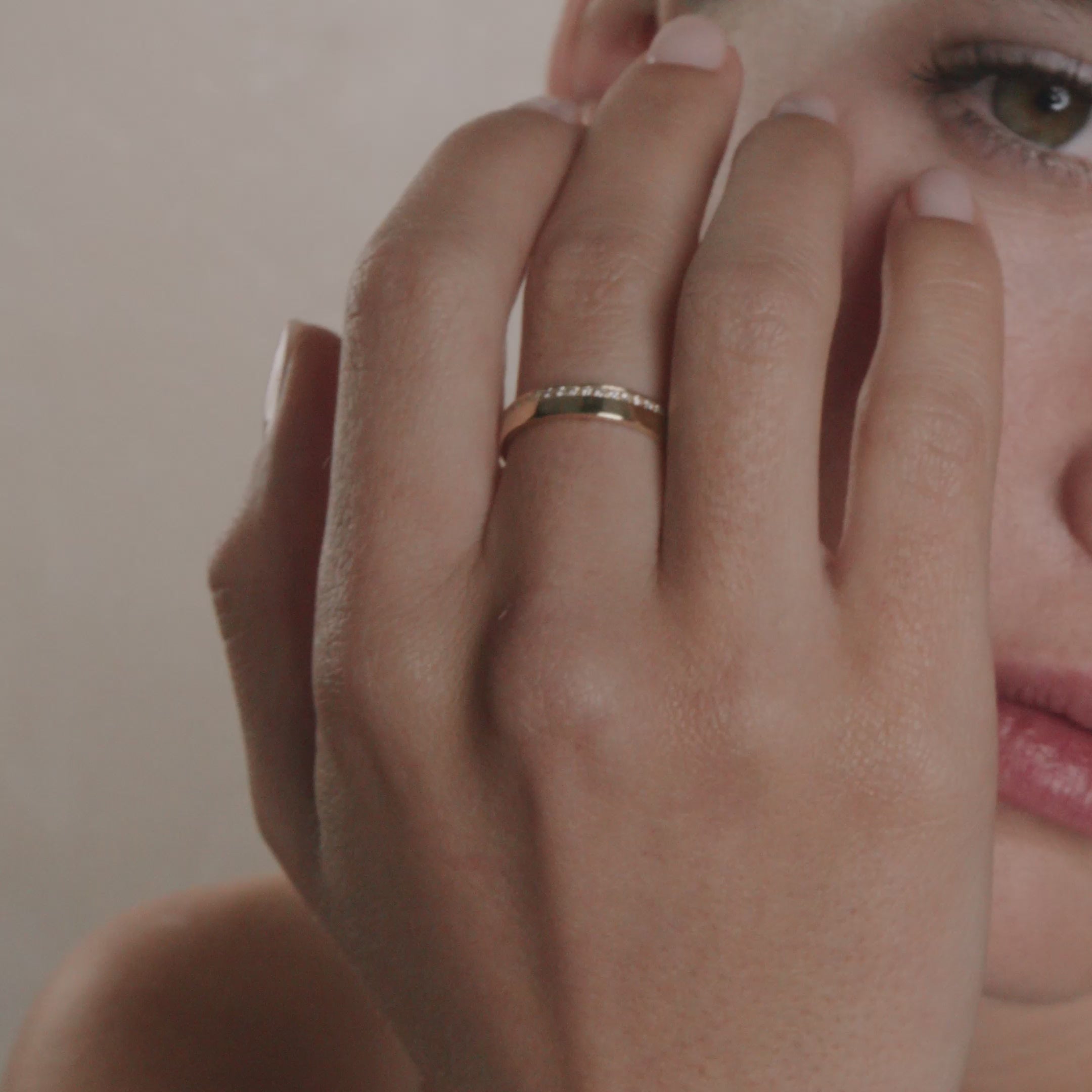 A modern take on the classic wedding band, with delicate pavé-set diamonds around the bottom half of the band. This will fit under your engagement ring perfectly.