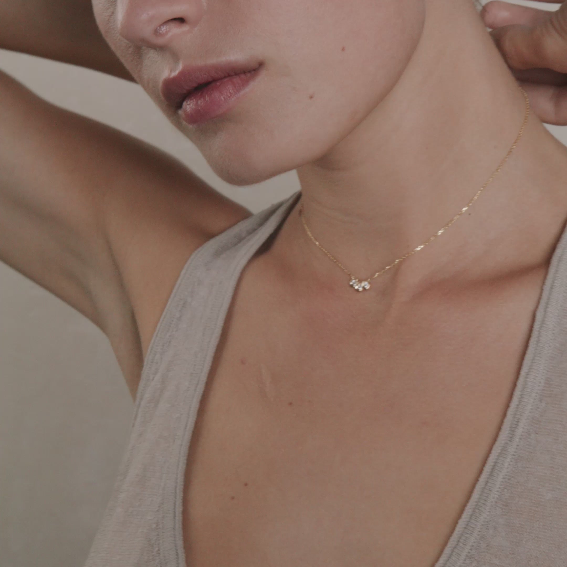A beautiful necklace set with three dainty diamond. Perfect for any occasion and everyday wear. This stunning, unique piece is also fun as a layering addition to any neck mess.