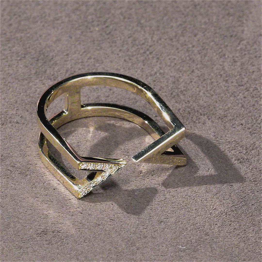 Set with 0.045CT hand-picked diamonds and a smooth gold finish, the double triangular ring echoes an architectural design. This piece represents a journey of a strong relationship, expressing the balance and perpetual power that partners bring to one another.