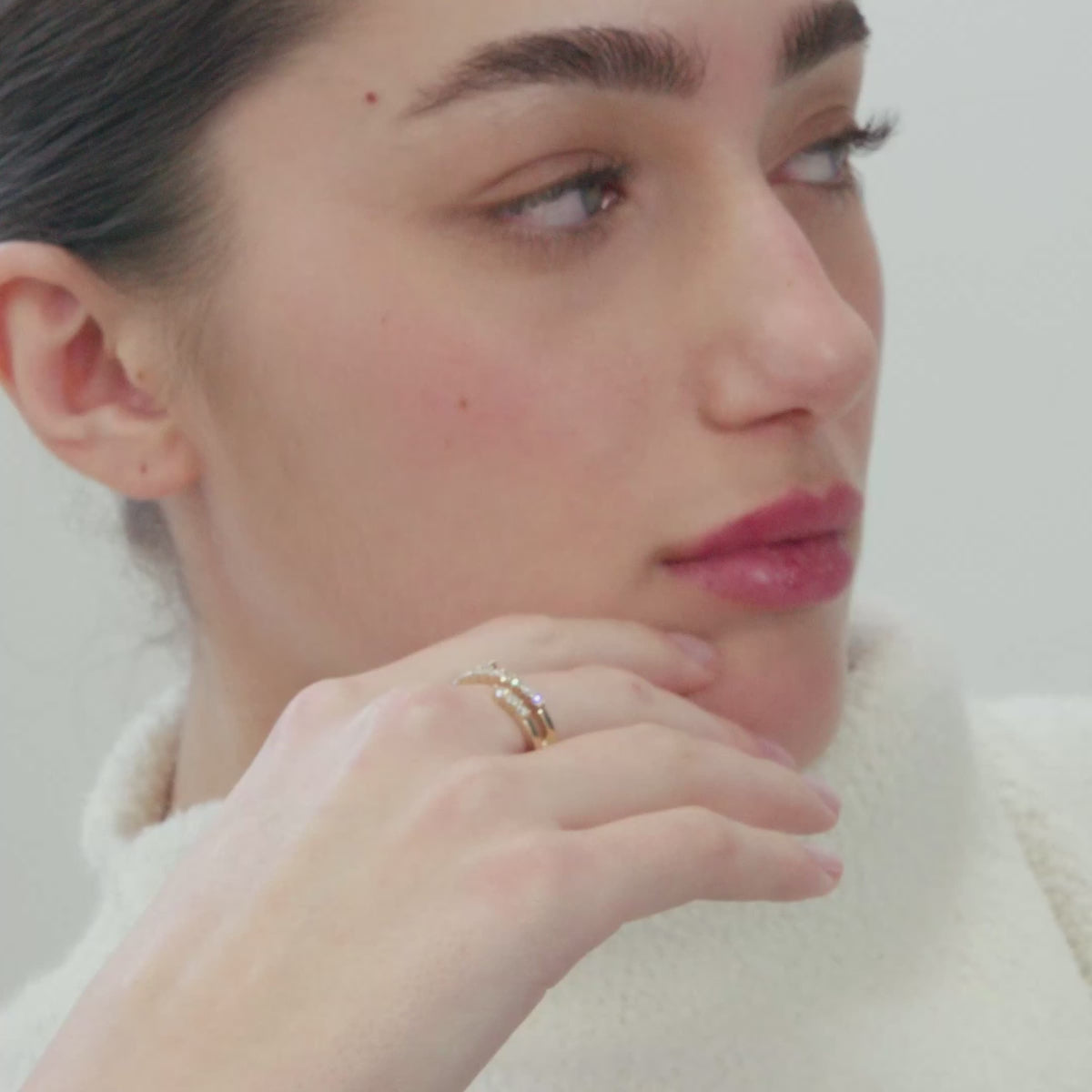 This ring is elegantly set with 15 round brilliant diamonds in three rows. An unusual and yet classic band with impressive presence.