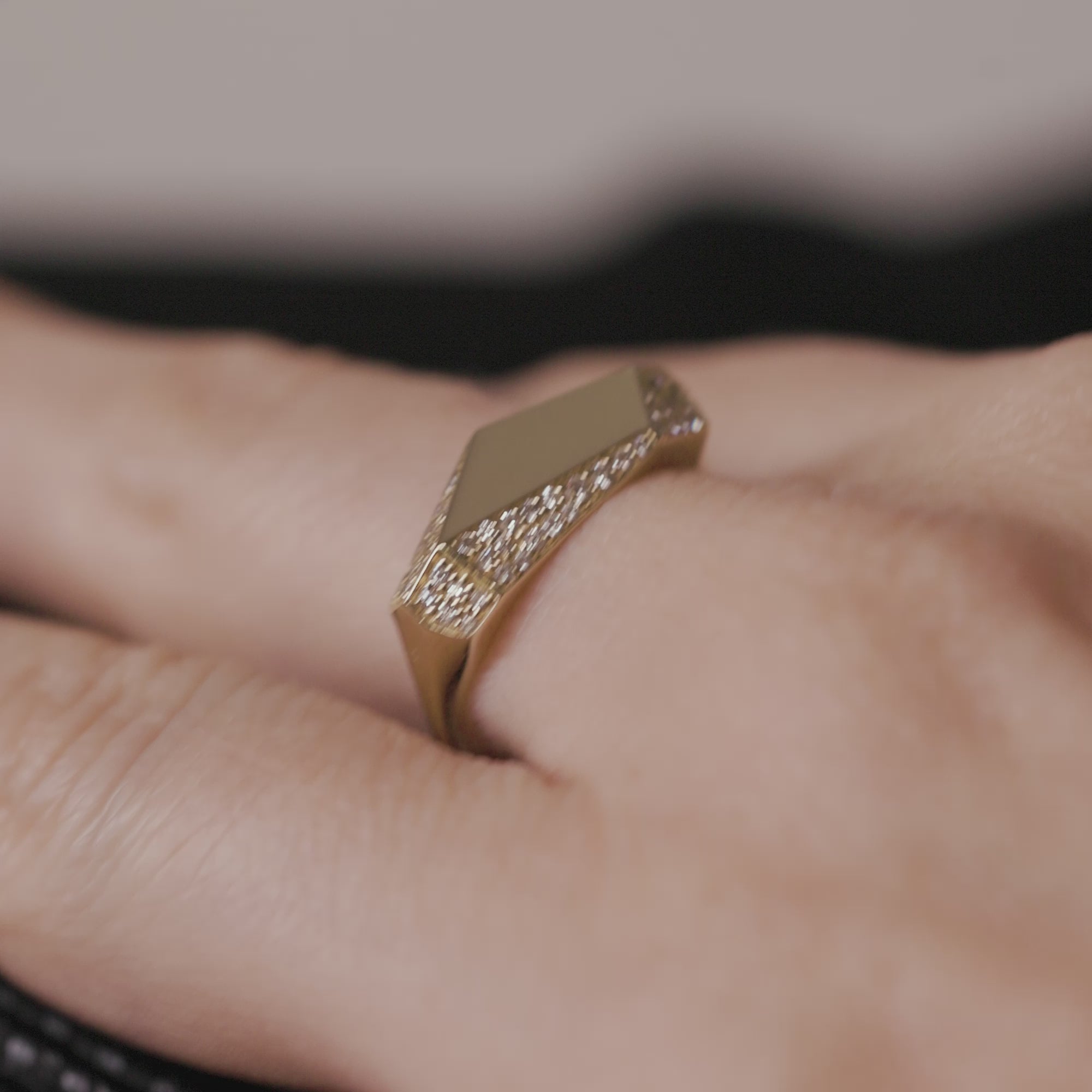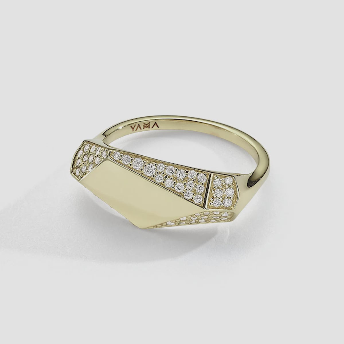 A geometric ring with a beautiful flare of pavé diamonds. It can be worn on your pinky for its classic look or on any other finger for a bold, edgy look.