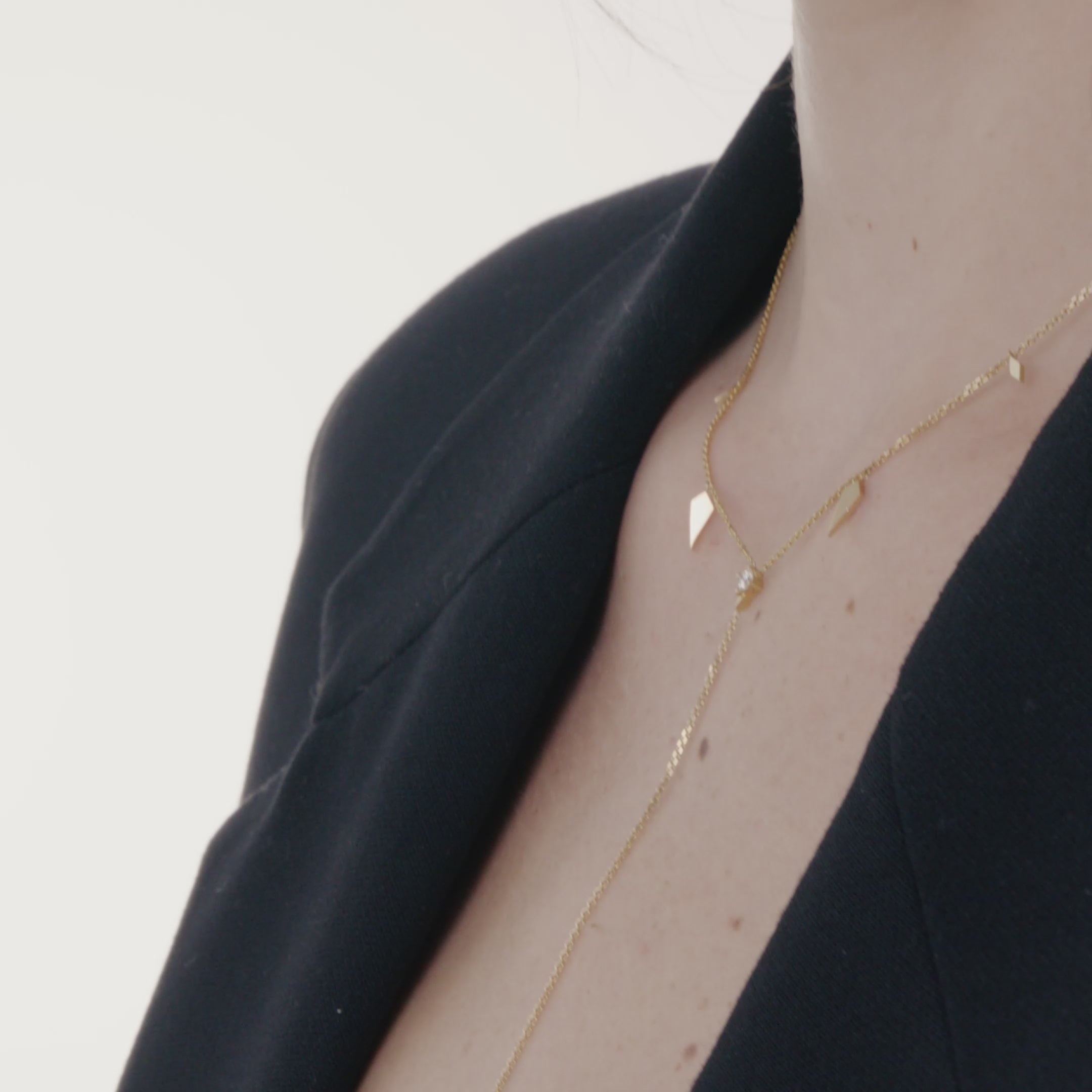 A sexy drop necklace set in 14K gold with a s glittering center diamond, accompanied with kite and jagger shaped details.