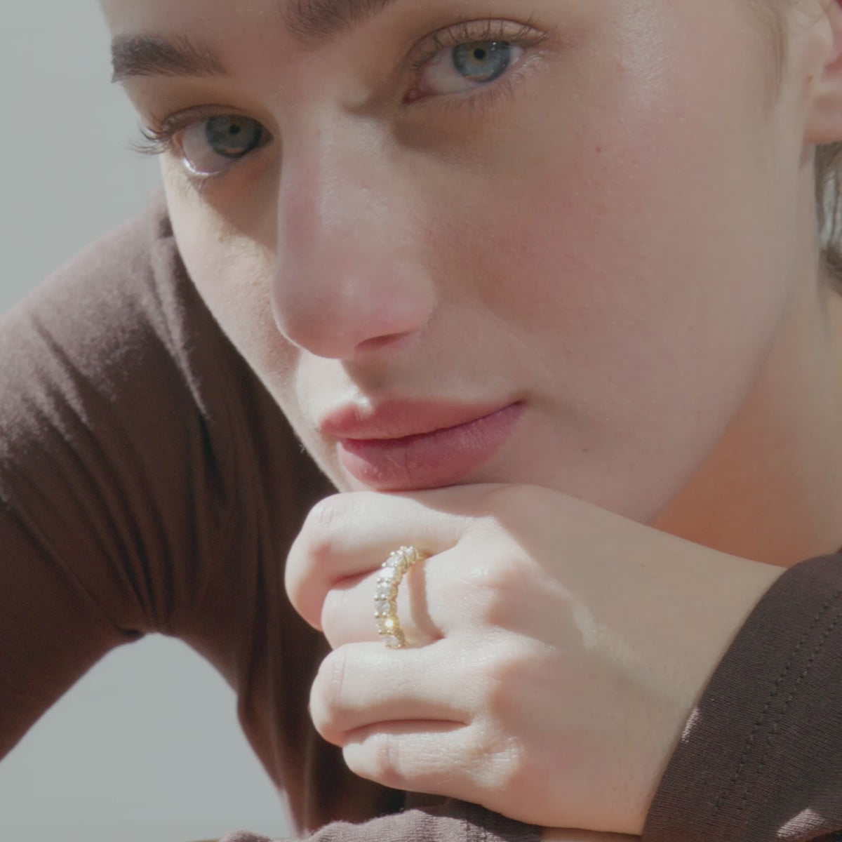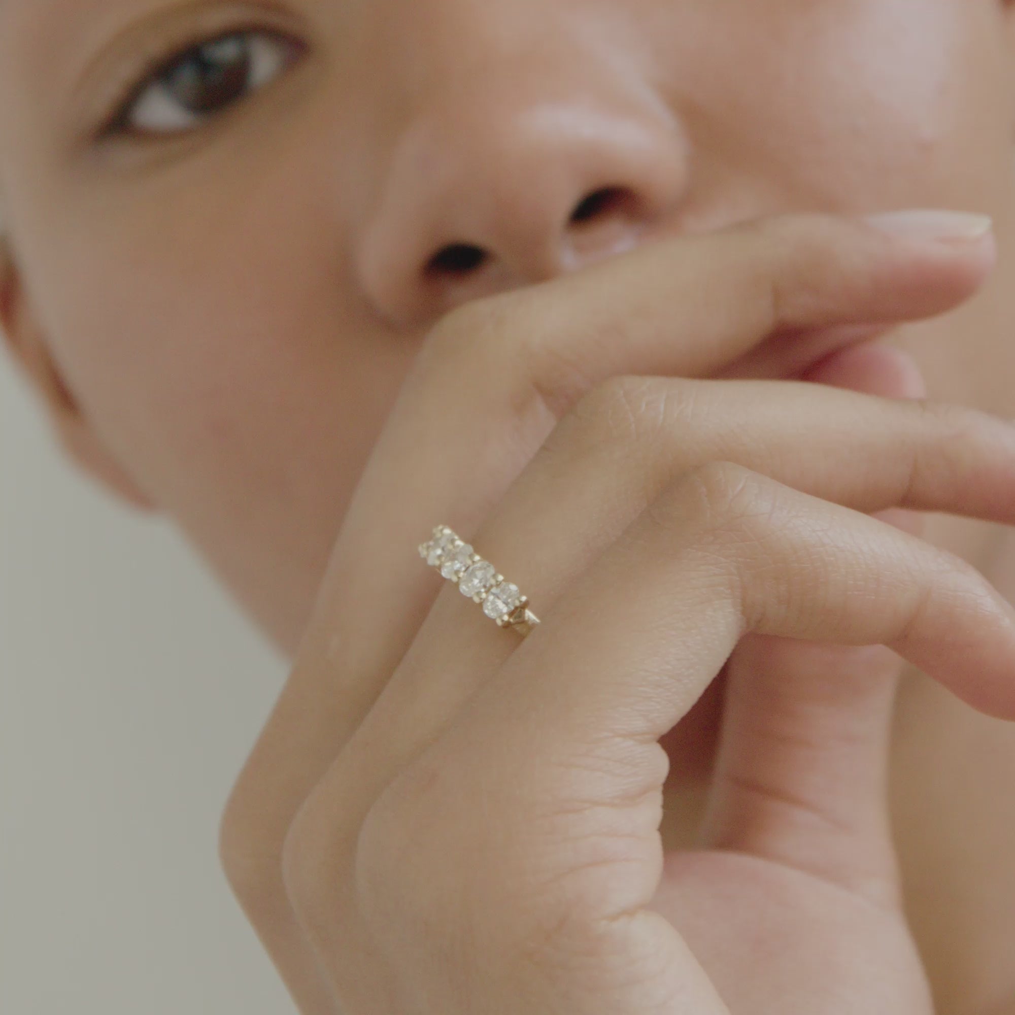 A classic half eternity band, redefined by YAMA. The oval stones are handpicked, making this ring extremely special. It is engravable on the back to make it even more meaningful.