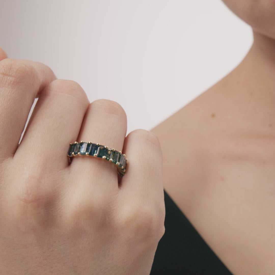 This half-eternity band ring features a beautiful suite of blue rectangle-cut sapphires that sit seamlessly on our signature gold ring. This classic ring with a YAMA twist is engravable on the back to make it truly special.