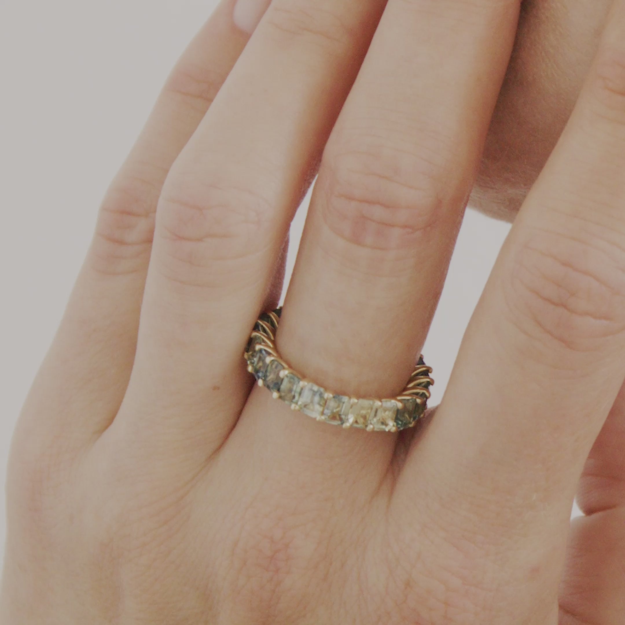This stunning eternity band ring features a beautiful suite of blue emerald-cut sapphires that sit seamlessly on our signature gold band.