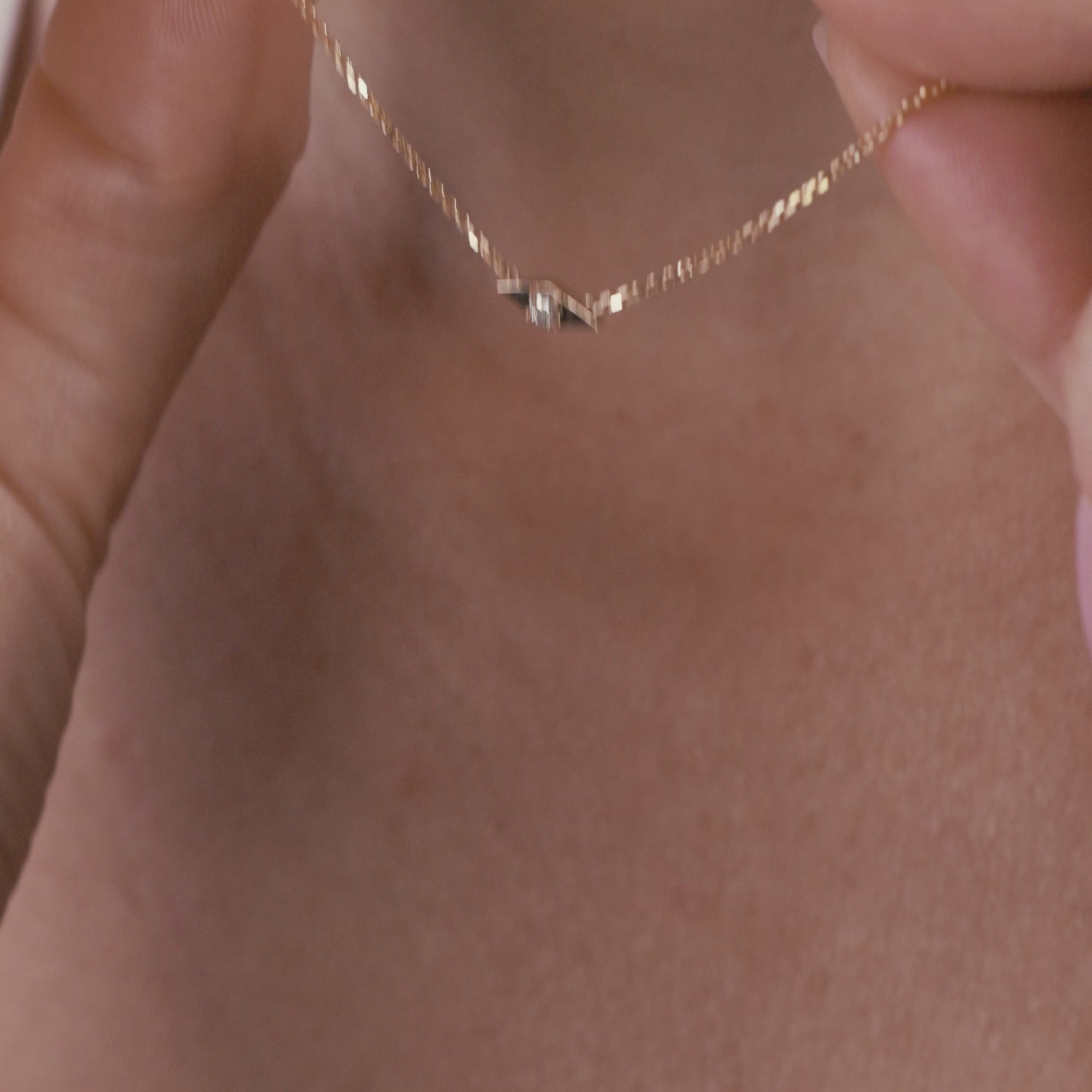 A simple and delicate rhombus shaped pendant that can be set with different gems or diamonds, making this necklace perfect for stacking.