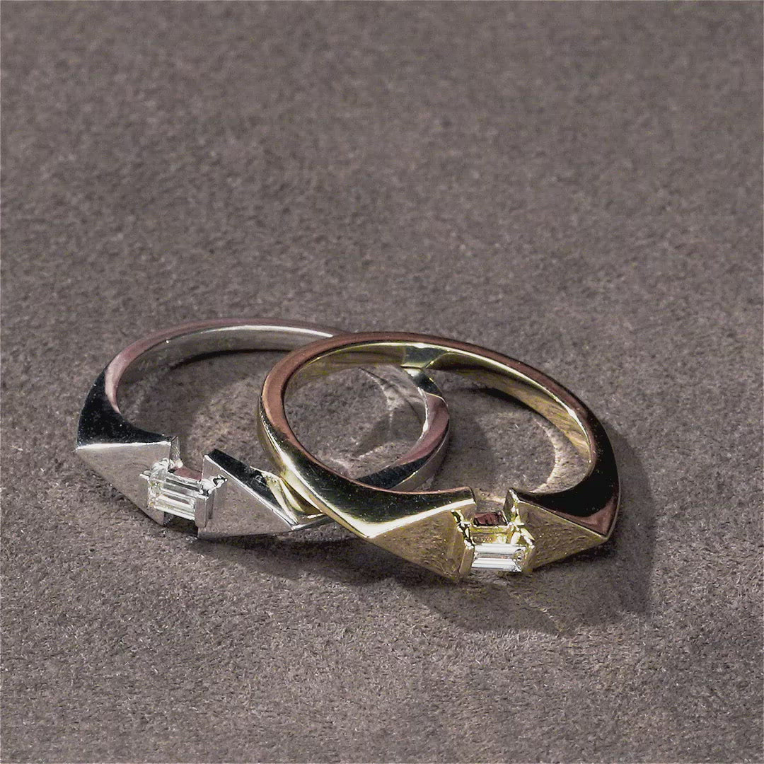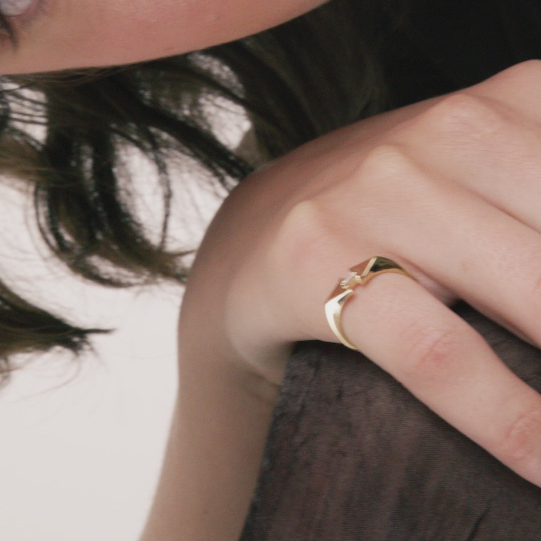 This rhombus-shaped ring is set with a 0.10CT baguette diamond on top. This piece is perfect for stacking with a V-shaped ring or wearing on your pinky.