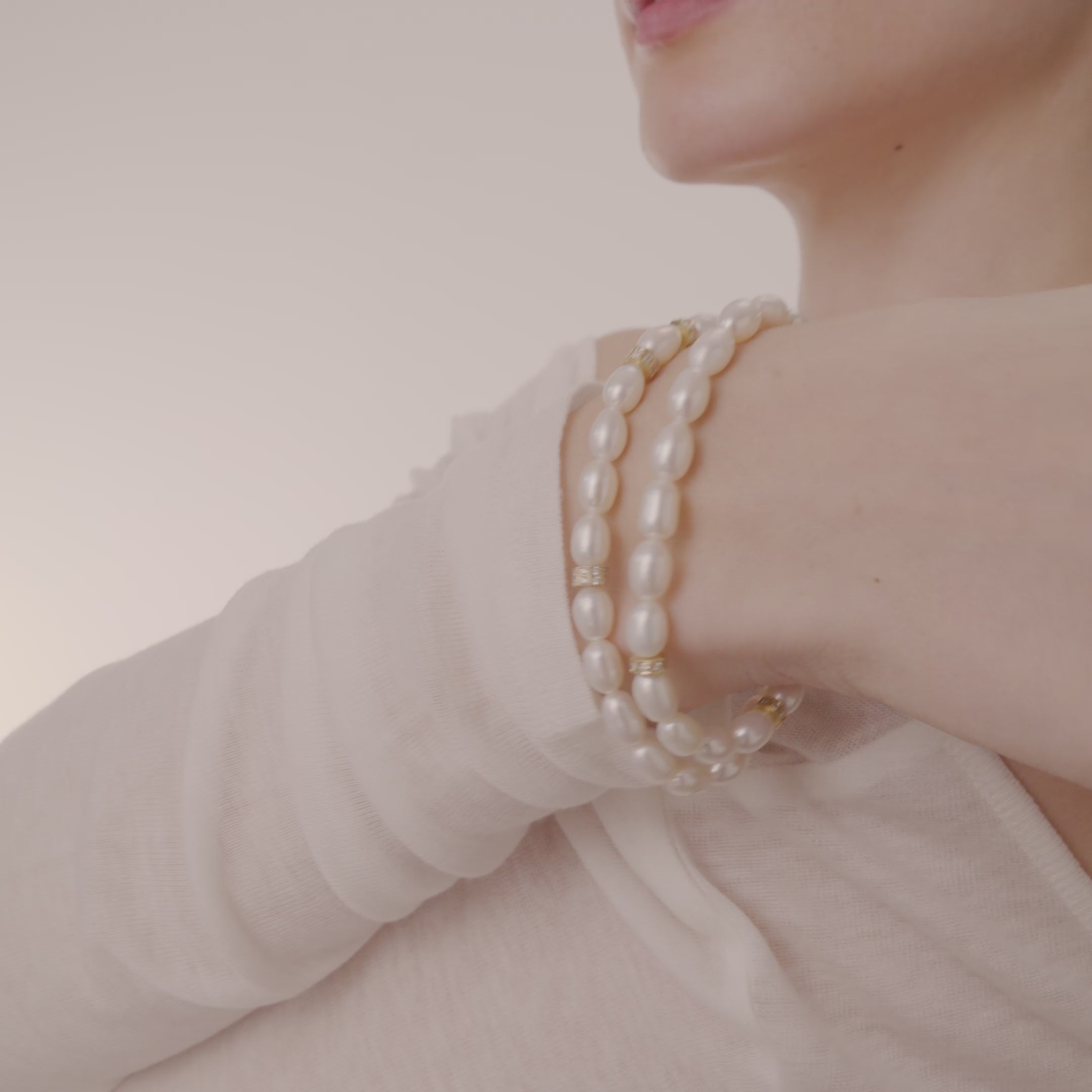 This elegant bracelet features a stunning row of lustrous pearls, embellished with gold and diamond beads for a luxurious touch.
