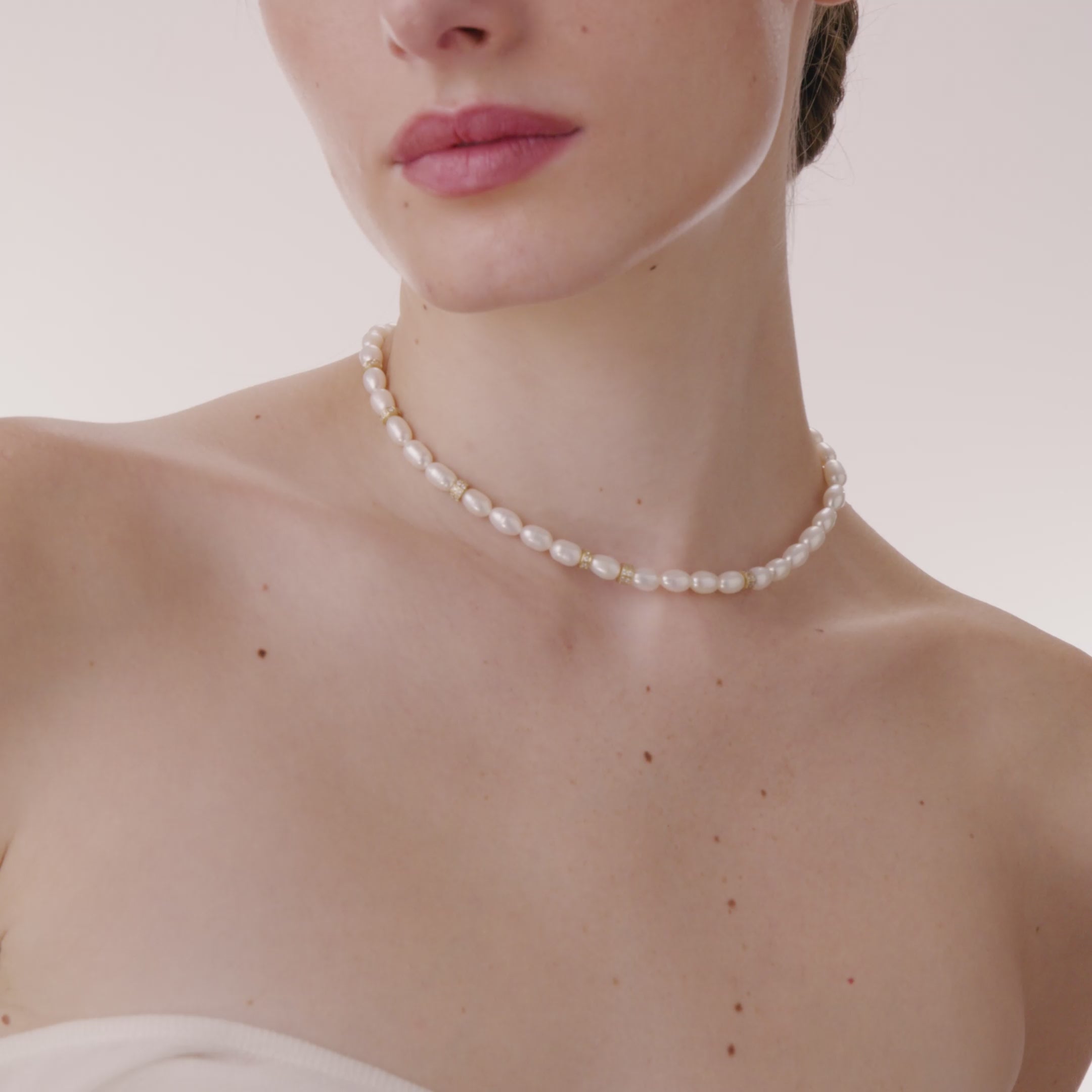 A beautiful and timeless piece , a row of shiny pearls, decorated with gold beads set with diamonds.