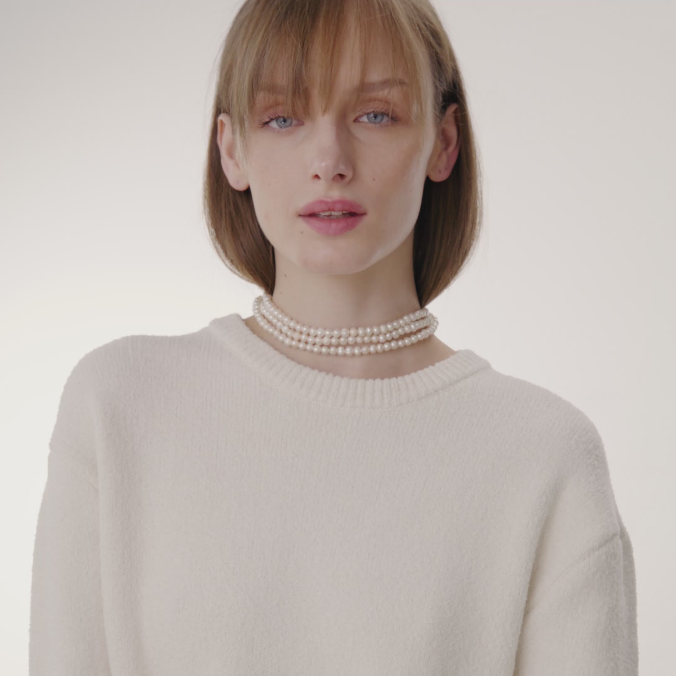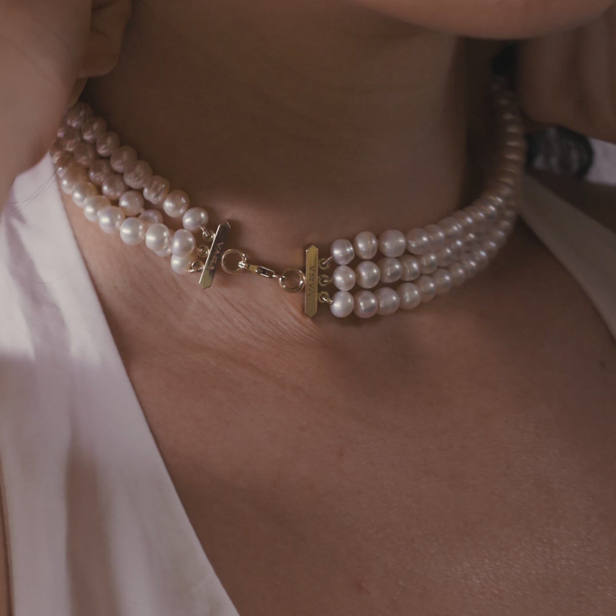 Triple rows of shiny pearls, connected to a fine gold detail spacing between the chains, creating this perfect layered look.