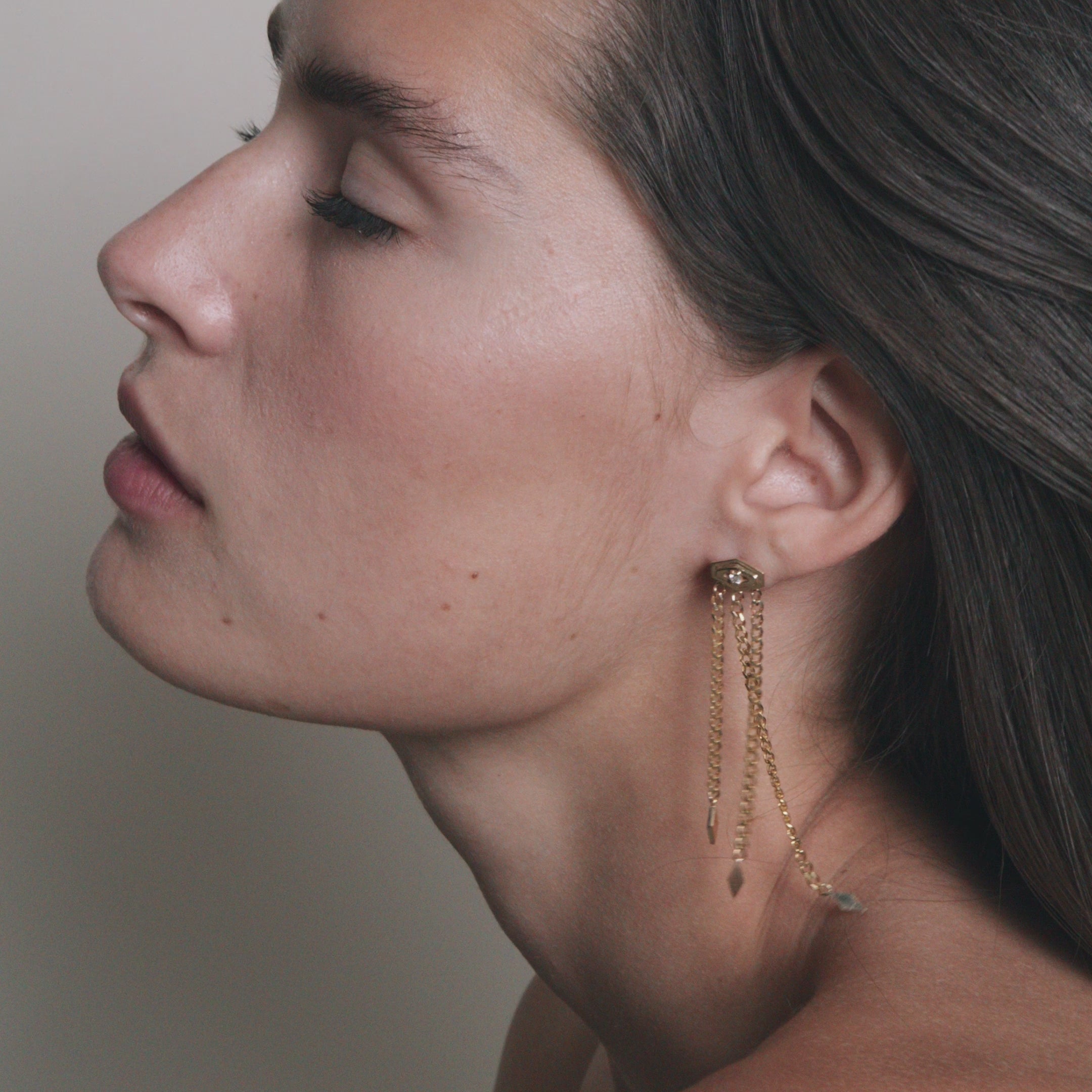 A beautifully unique drop earring that is set with three strings ending with a small jagger element. The glittered chain along with the small diamond creates an elegant outstanding fun look.