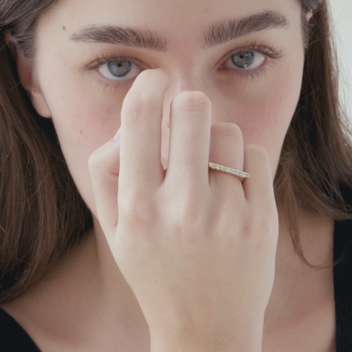 A classic and edgy ring with round cut diamonds seamlessly set across the gold band.