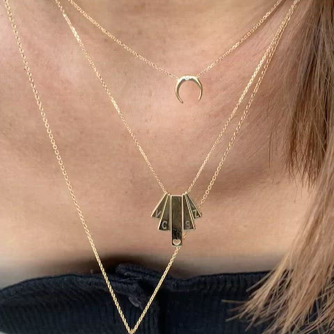 This necklace includes five beautiful, geometric pendants with a heart carved out of the center charm. Each pendant has space for you to add a meaningful engraving, creating a piece that will celebrate love, life, and help cherish memories for years to come.