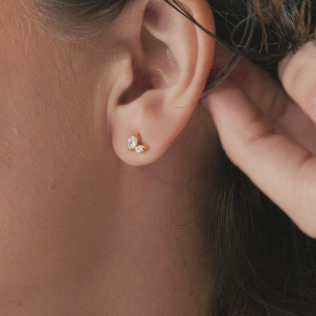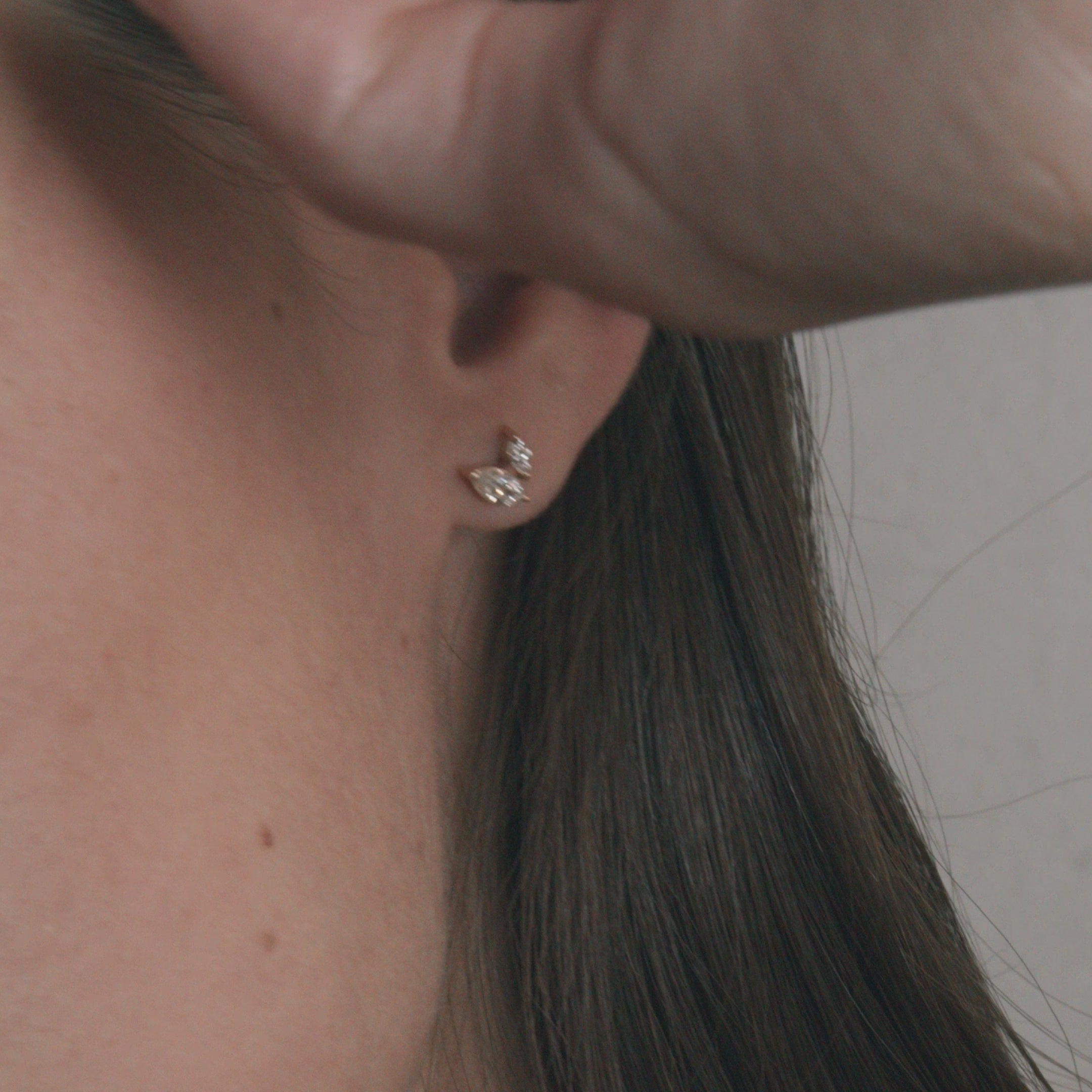 A classic and elegant two-stone stud. Can be worn as a pair in the first hole for a simpler look, or individually in the second or third hole to spice up your ear party.