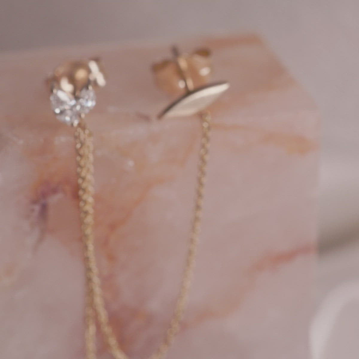 A beautifully unique drop earring that is set with bright marquise diamonds. The glittered chain along with the diamonds creates an elegant, fun look. Two holes are required to wear this piece.