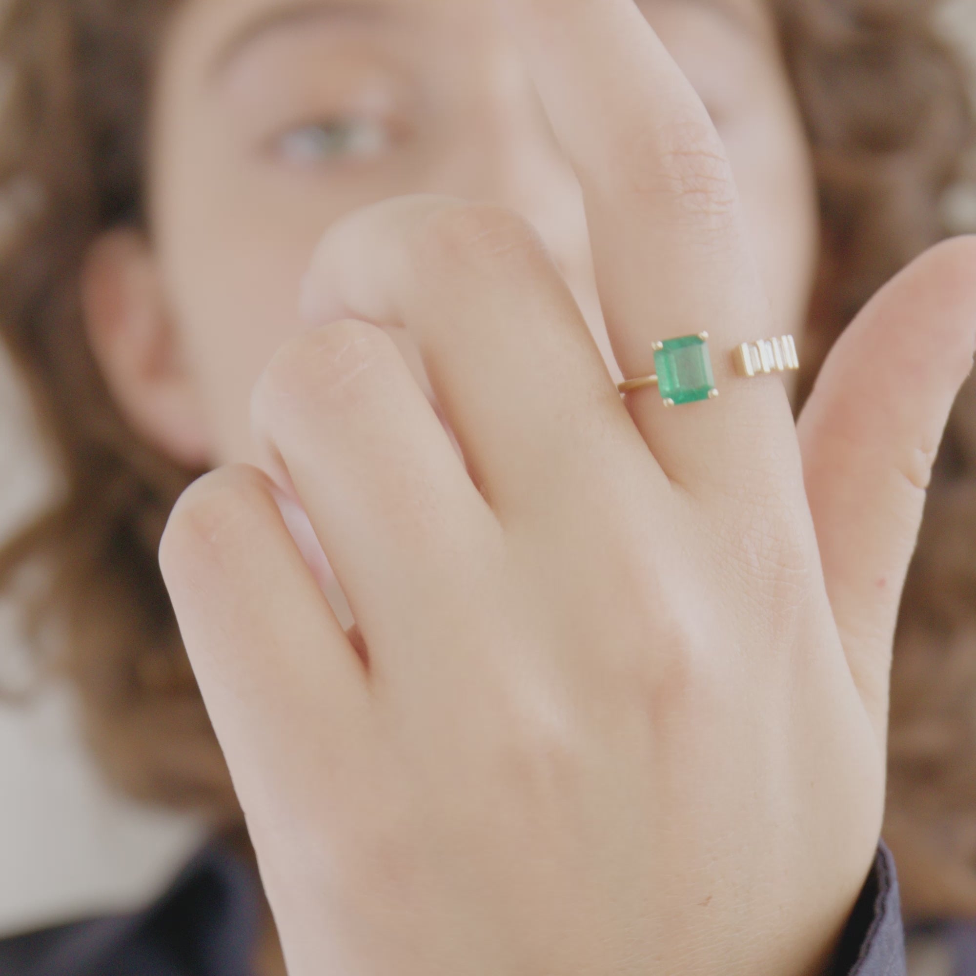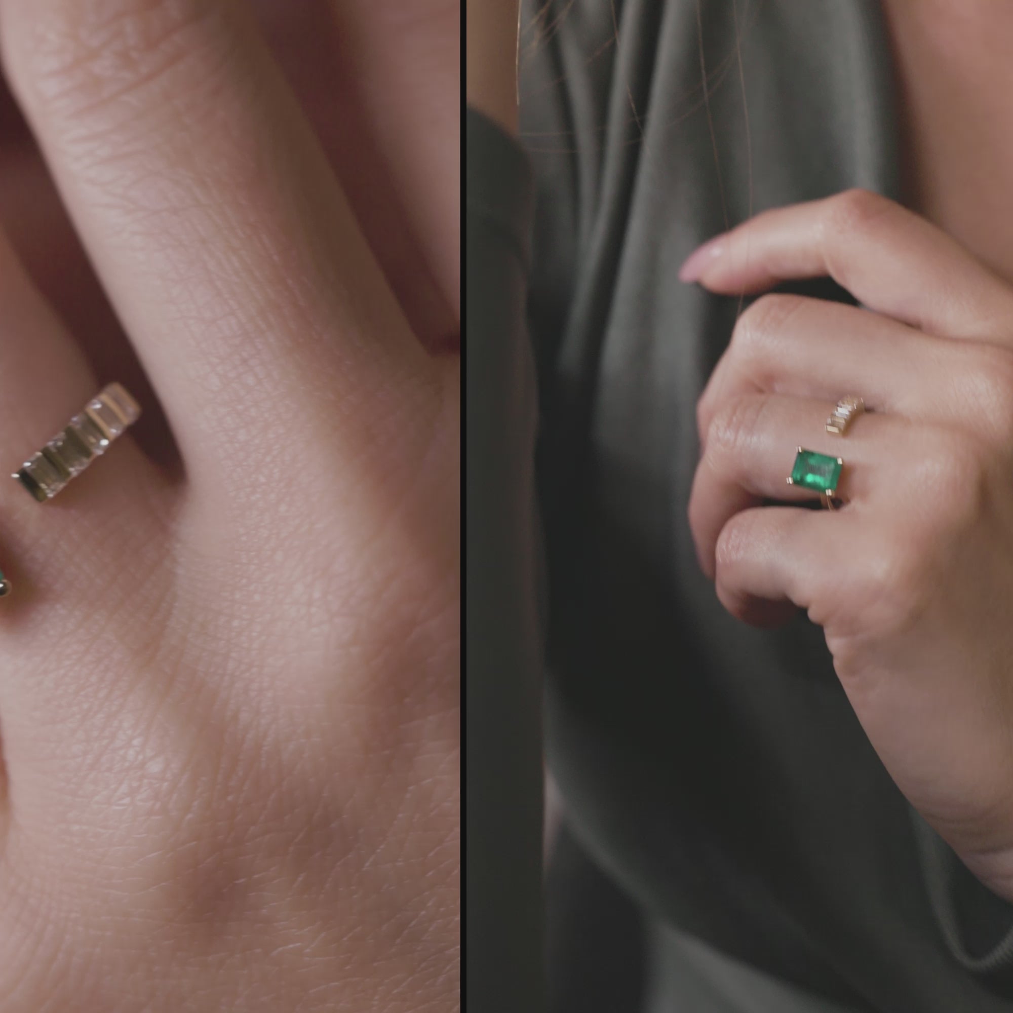 Set with a 0.80-2.20CT emerald cut emerald stone (2.20CT in picture) & side diamond baguettes, this ring is unique in its geometric beauty.