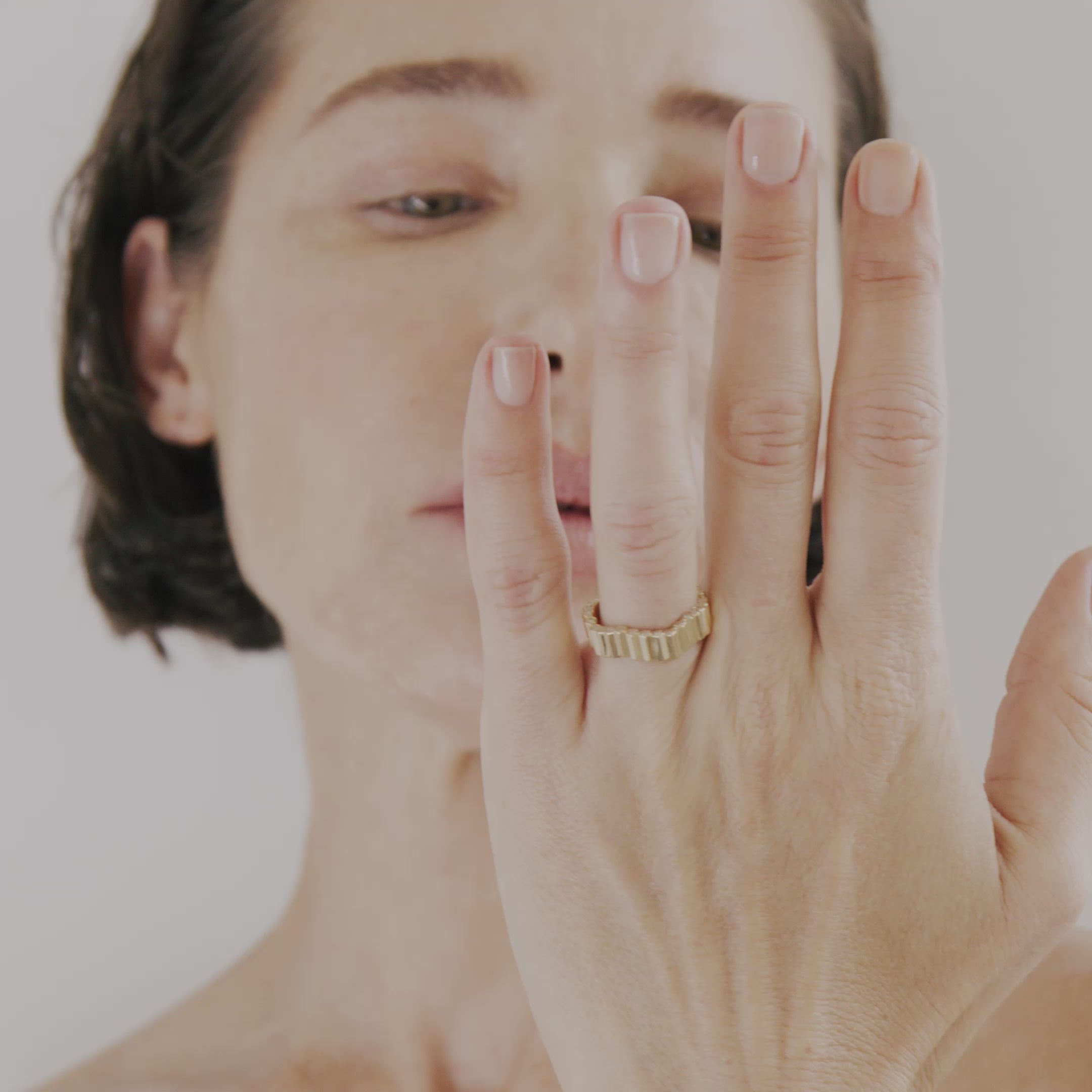 Set with 0.35CT hand-picked diamonds, the double triangular ring echoes an architectural design. This piece represents a journey of a strong relationship, expressing the balance and perpetual power that partners bring to one another.