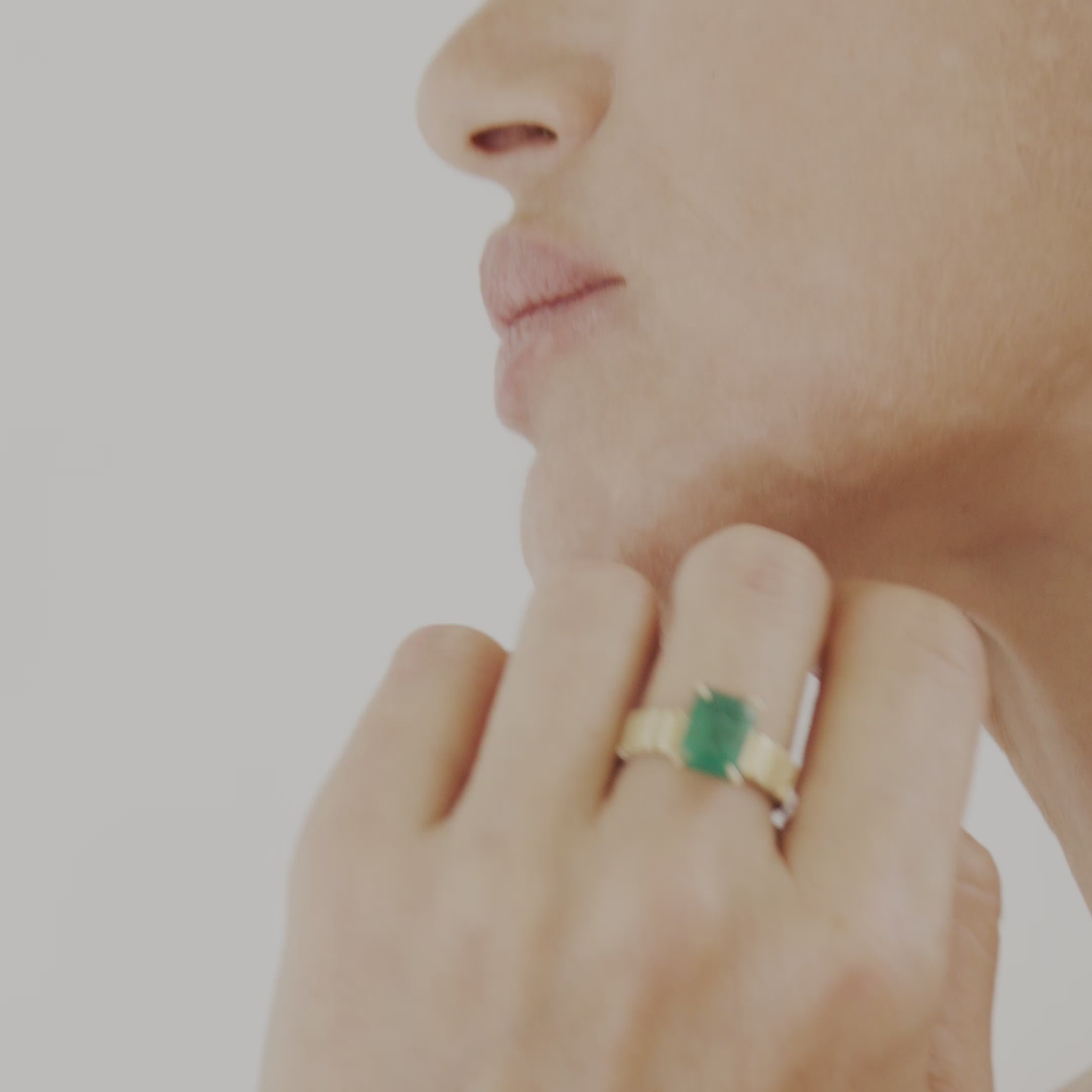 Set with an amazing emerald cut emerald stone & baby round diamonds in a hidden setting, this ring is unique in its geometric beauty.
