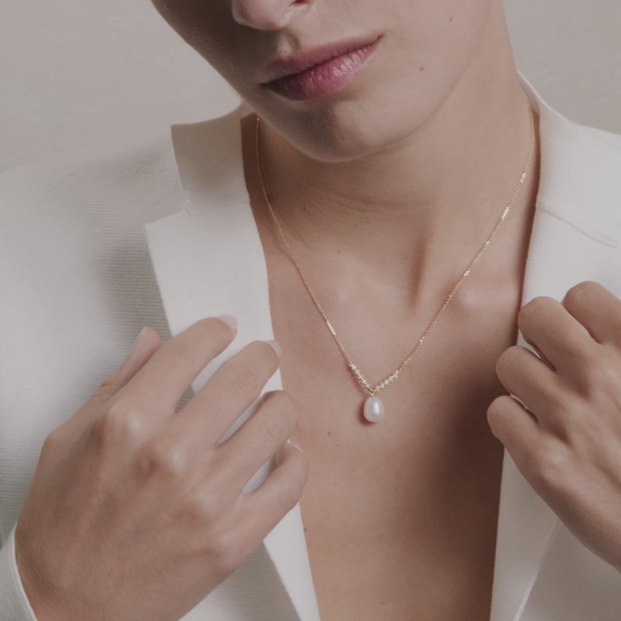 A unique necklace mixing a timeless baroque pearl with two geometric diamond elements.