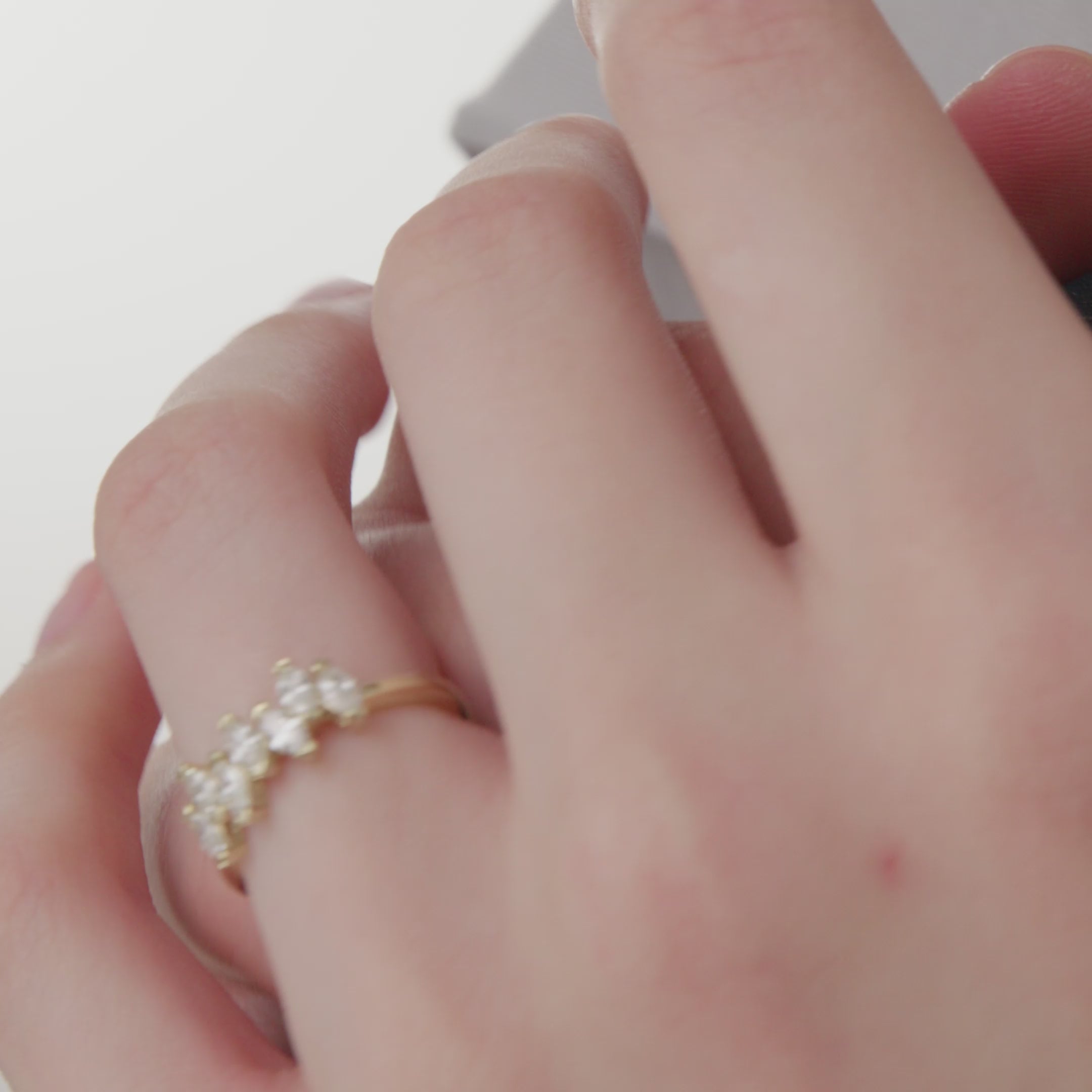 An eye-catching ring set with marquise cut diamonds on a rounded shank. Fits any engagement ring perfectly, but also works as a stand-alone piece.