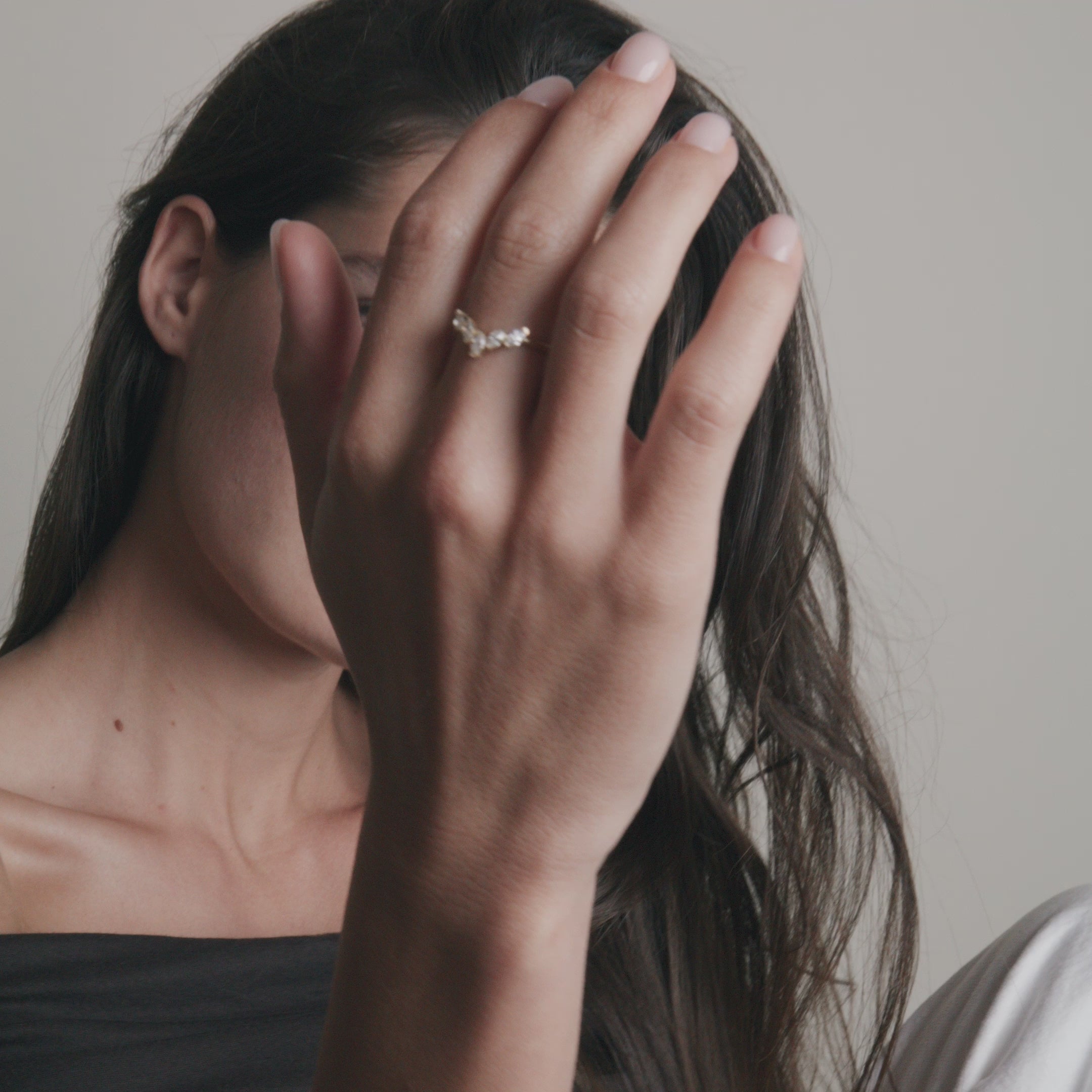 A V-shaped ring set with 5 marquise diamonds on a rounded shank. Perfect for stacking with any ring or as a stand-alone piece.
