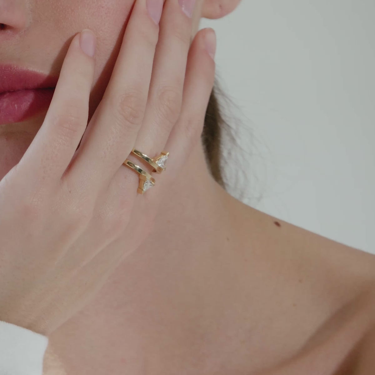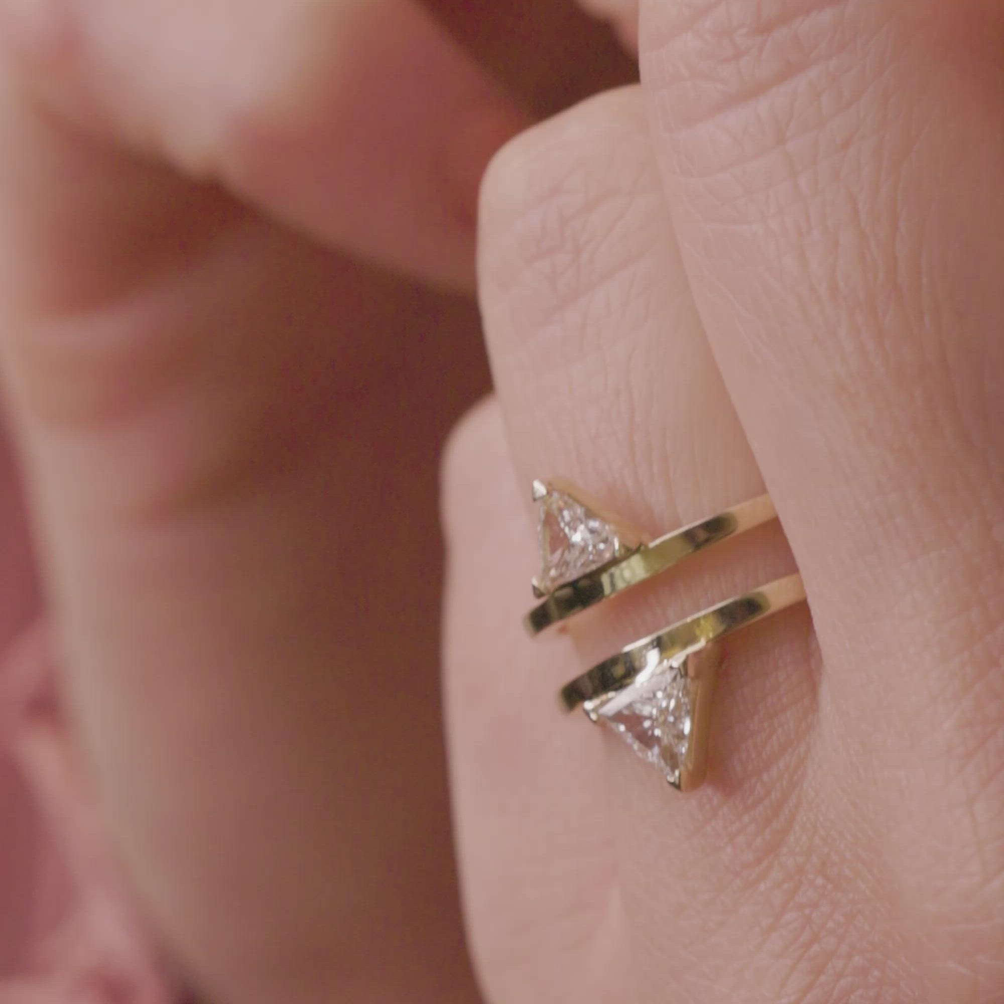 This double-lined ring is cast in 14K gold and is set with two beautiful triangular trillion diamonds.