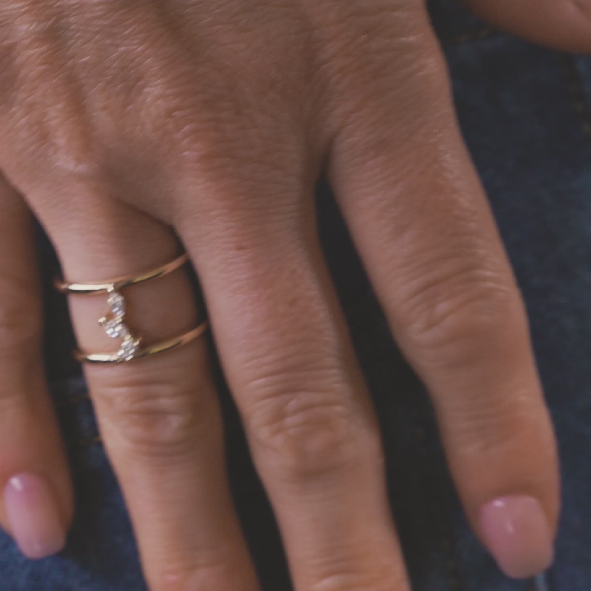 A delicate ring with a small party of marquise cut diamonds layered organically.