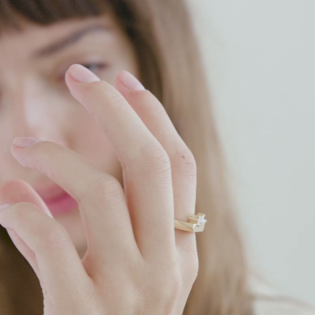 A beautiful signet ring with a small party of marquise cut diamonds layered organically.
