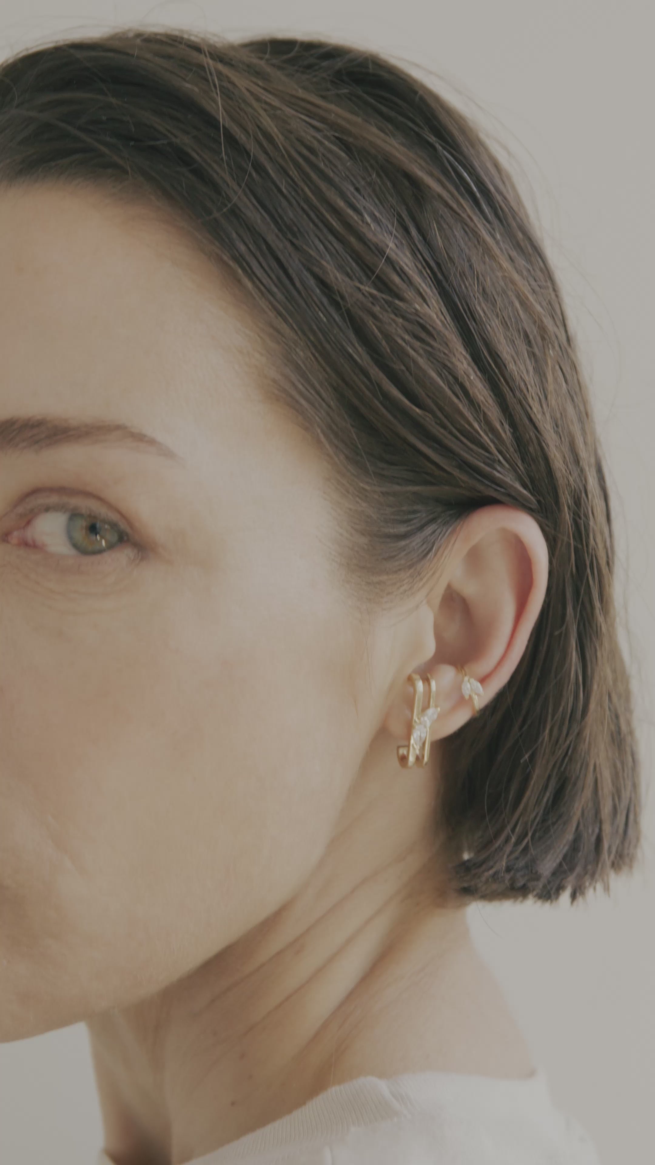 The clean, geometric lines on this earring highlight two pear-shaped diamonds in the center of this piece that sits perfectly on your lobe.