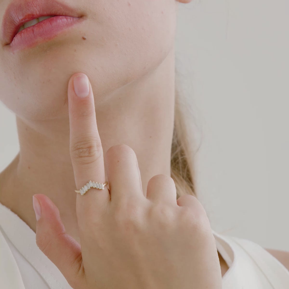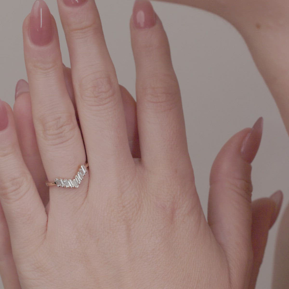An eye-catching ring set with 7 baguette diamonds on a rounded shank. Fits perfectly with any engagement ring, but can also be worn as a stand-alone piece.