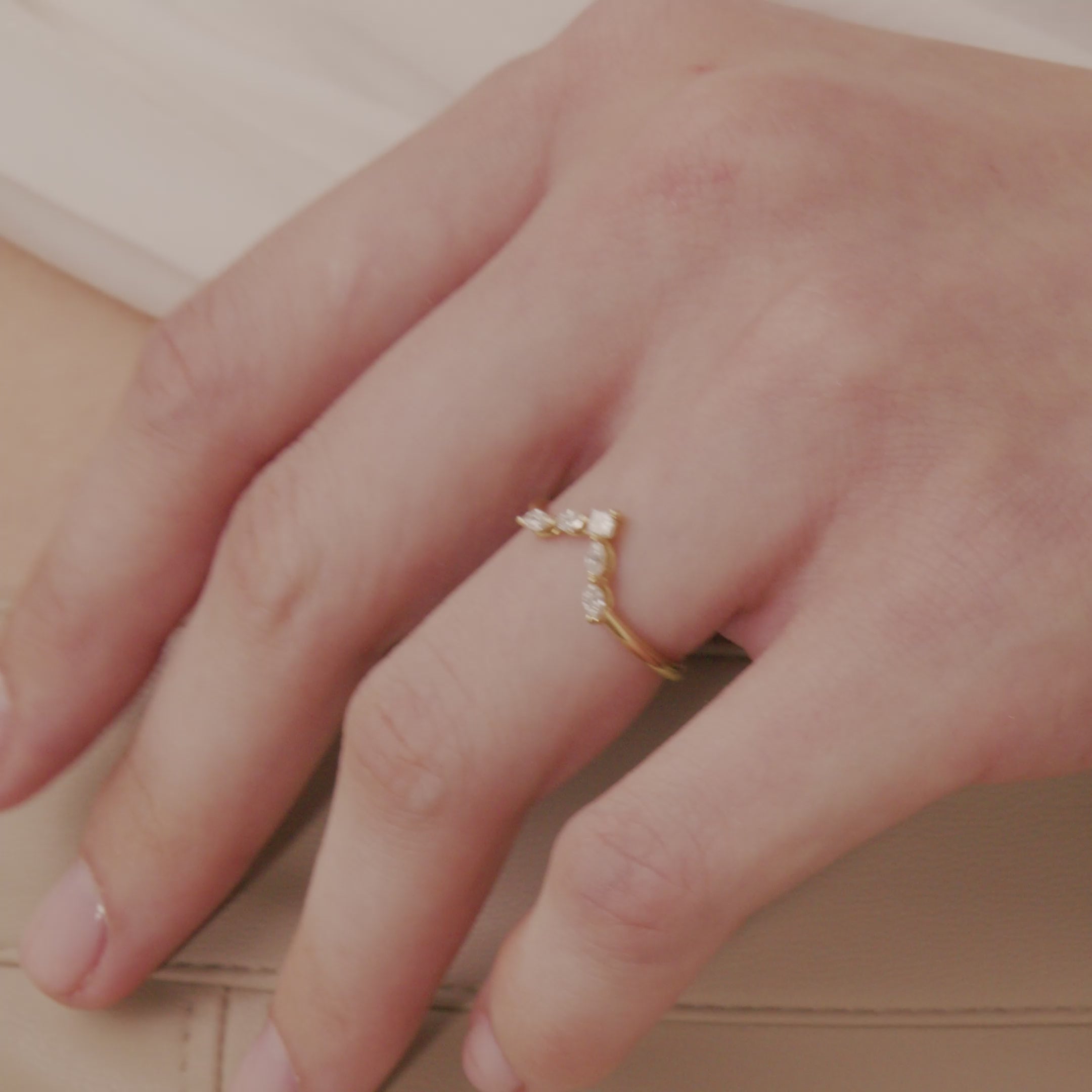 A unique V-shaped ring set with 5 diamonds in a special layout, with a total of 0.25-0.30CT diamonds, set on 14K gold. This piece is truly unique.