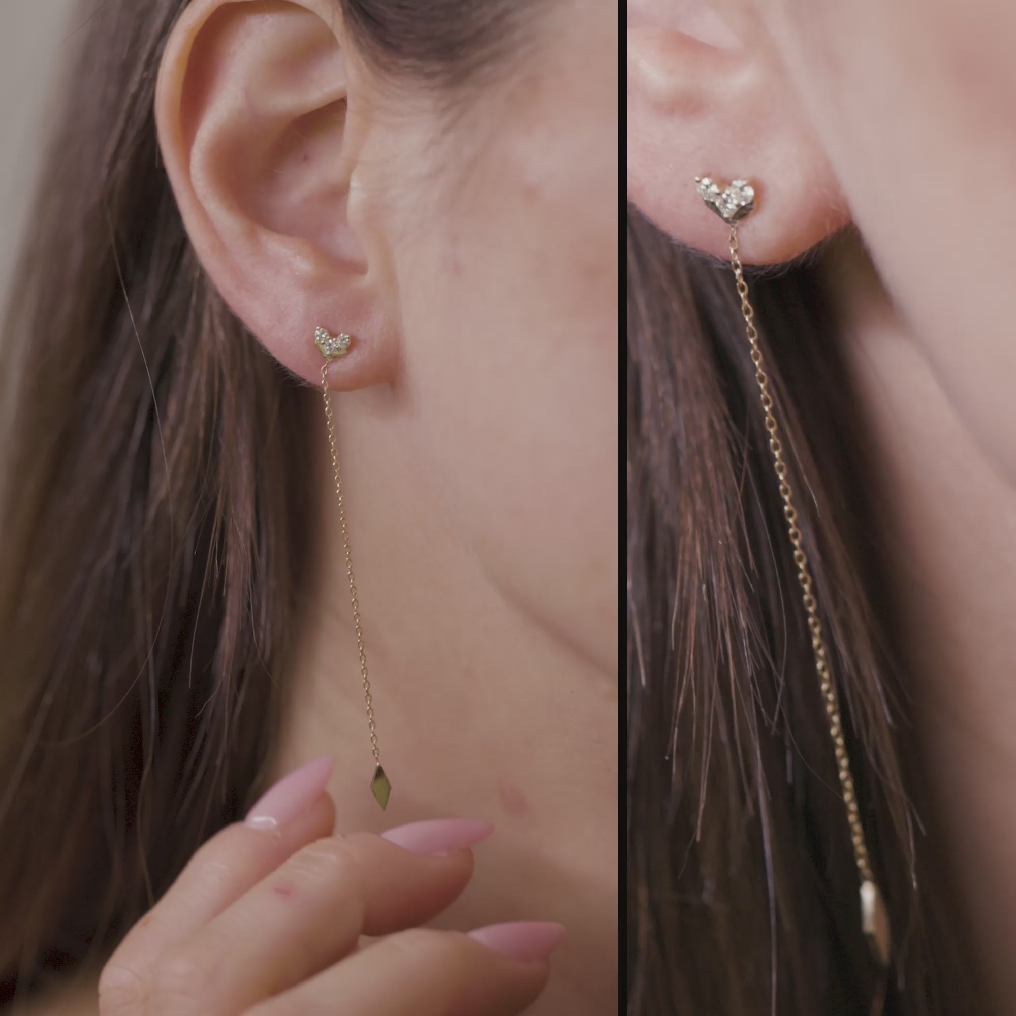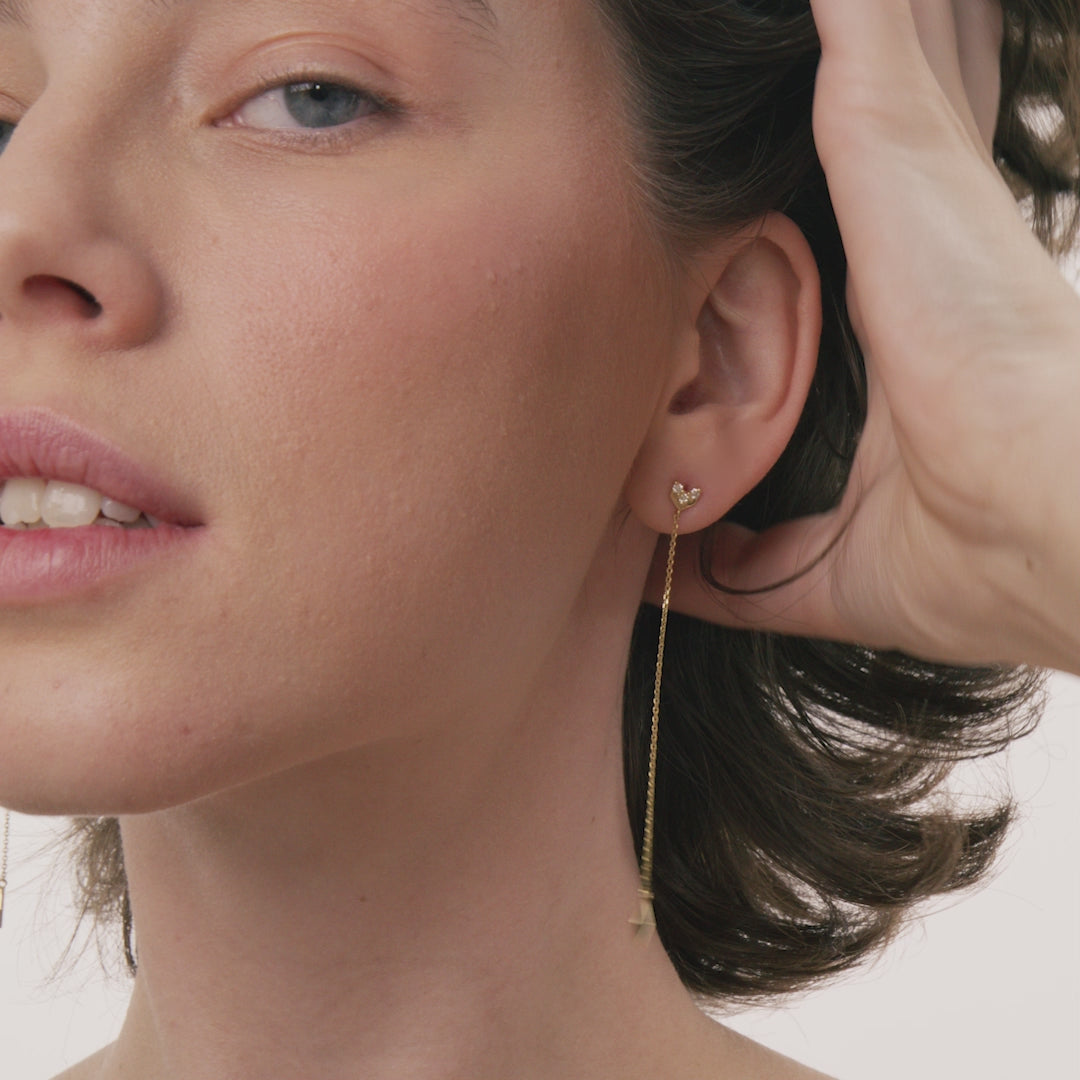 A long drop earring that is set with bright pavé diamonds along with a glittered chain.