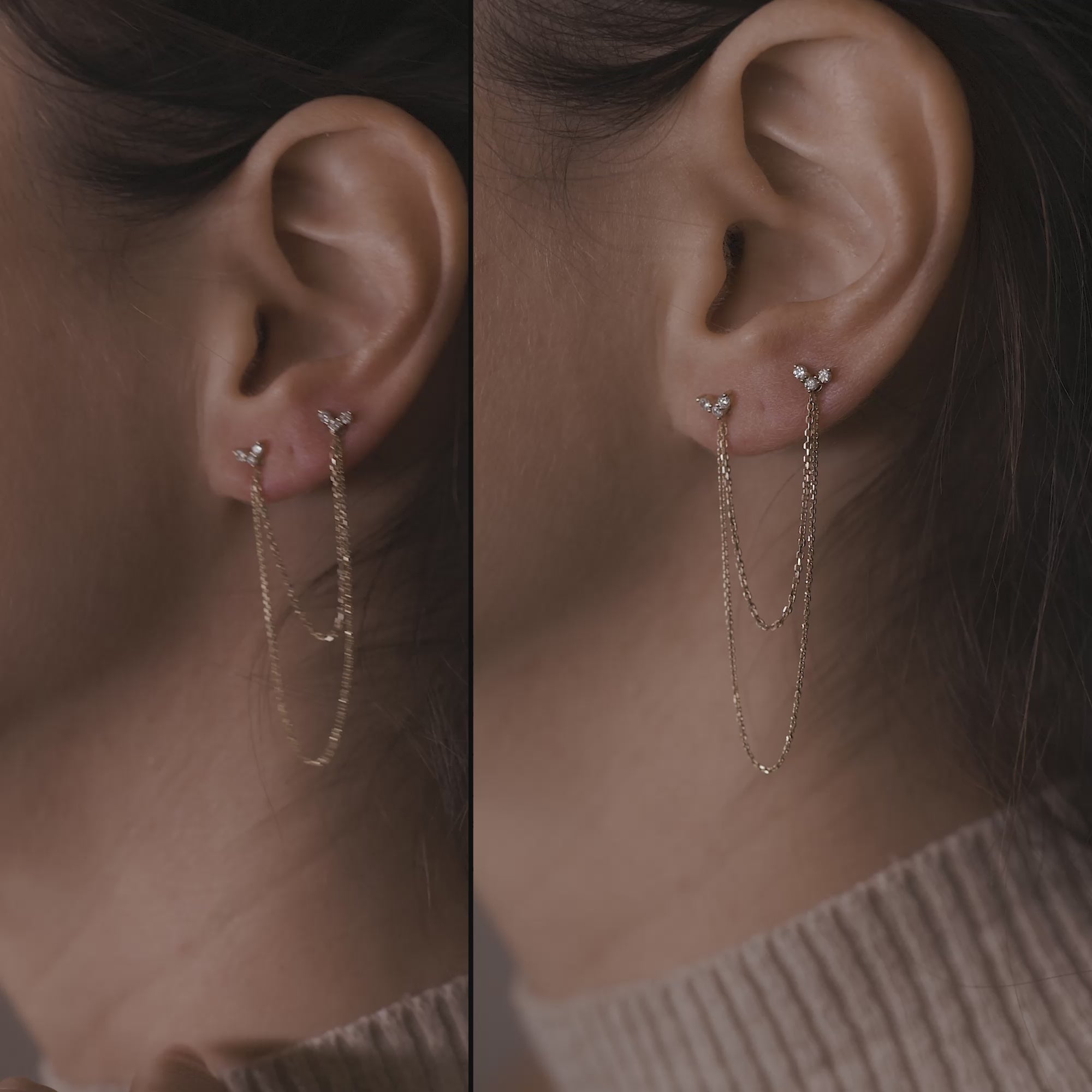 A beautiful drop earring that is set with bright pavé diamonds. The glittered chain along with the 0.15CT creates an elegant, fun look. ֿTwo holes are required to wear this piece. Back string is sold separately. To purchase the back piece, please click here.