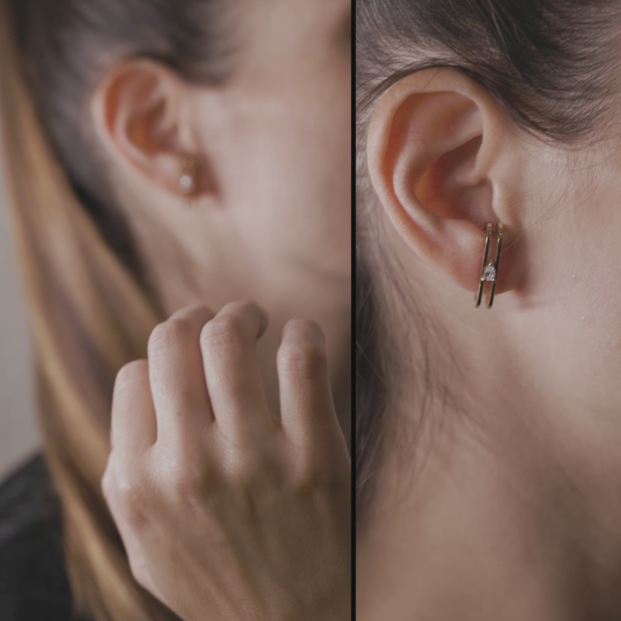 A simplistic earring with two lines and a pear shaped diamond elegantly placed in the middle.