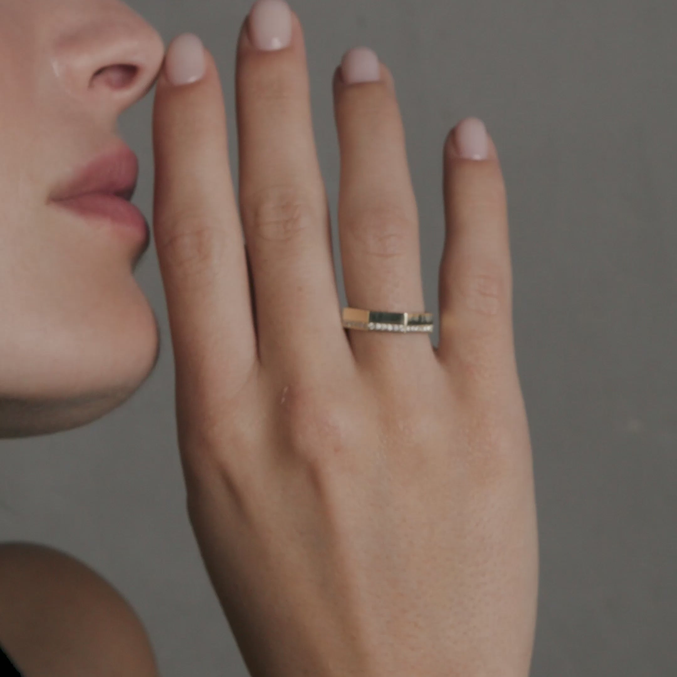 This octagon shaped ring is elegantly set with diamonds on the top half of the ring. A unique and beautiful piece.